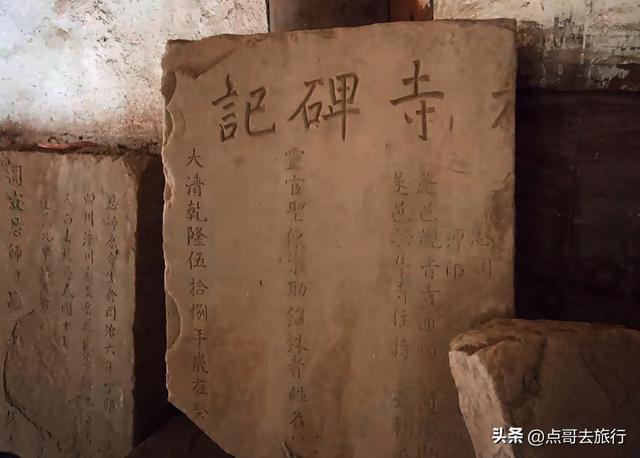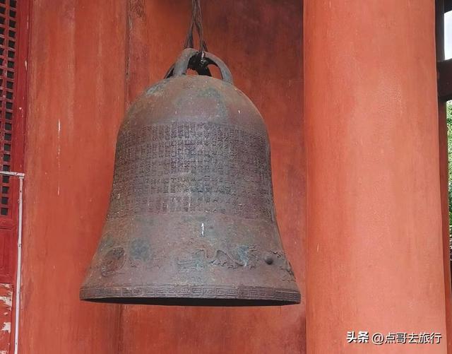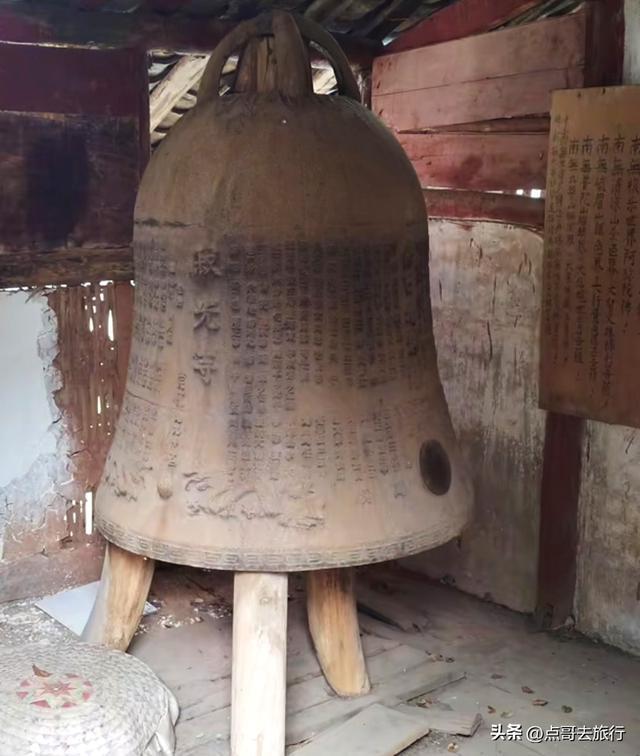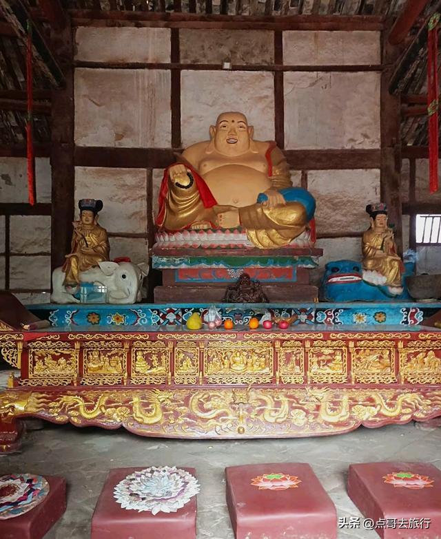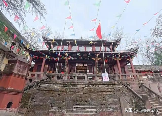 弥勒殿出来,沿石阶往上走,这里便是大雄宝殿。大雄宝殿前,这处小的石平台,是寺庙的古遗址,隋唐时期的讲经台,如果你不知道,就很容易被忽略掉。大雄宝殿内,三尊大佛,二十四珠天和十八罗汉。三尊座佛前的九节盘龙石刻大香炉,雕技精巧。在大雄宝殿左右两侧,是清代重建的木质钟楼、鼓楼。