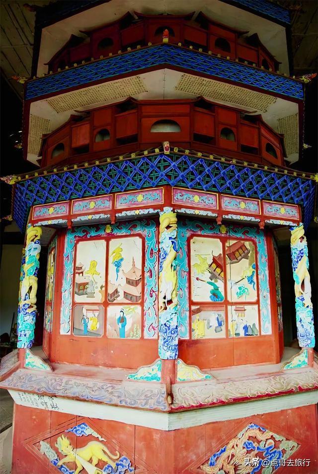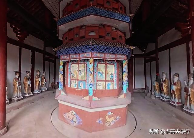 继续往上,就来到了寂光寺最精华的地方--转轮殿,其他寺庙是看不到的,非常珍贵和稀罕。转轮殿是寂光寺最为古老的古建,建于明正统八年(1443年),单檐歇山顶,井字形构架,穿斗与台梁式结构,典型的四川明代建筑风格。最特别的是,殿内造有一座可以转动的转轮幢(俗名星辰车),高约8米,直径4米,刻花鸟人物于幢壁。据说,转动转轮幢,寓意着平安顺遂。转轮幢很像一个巨型的走马灯,也是古人的旋转书架。我看着转轮幢,感觉转轮殿在寂光寺充当着的是,高配版的藏经阁。